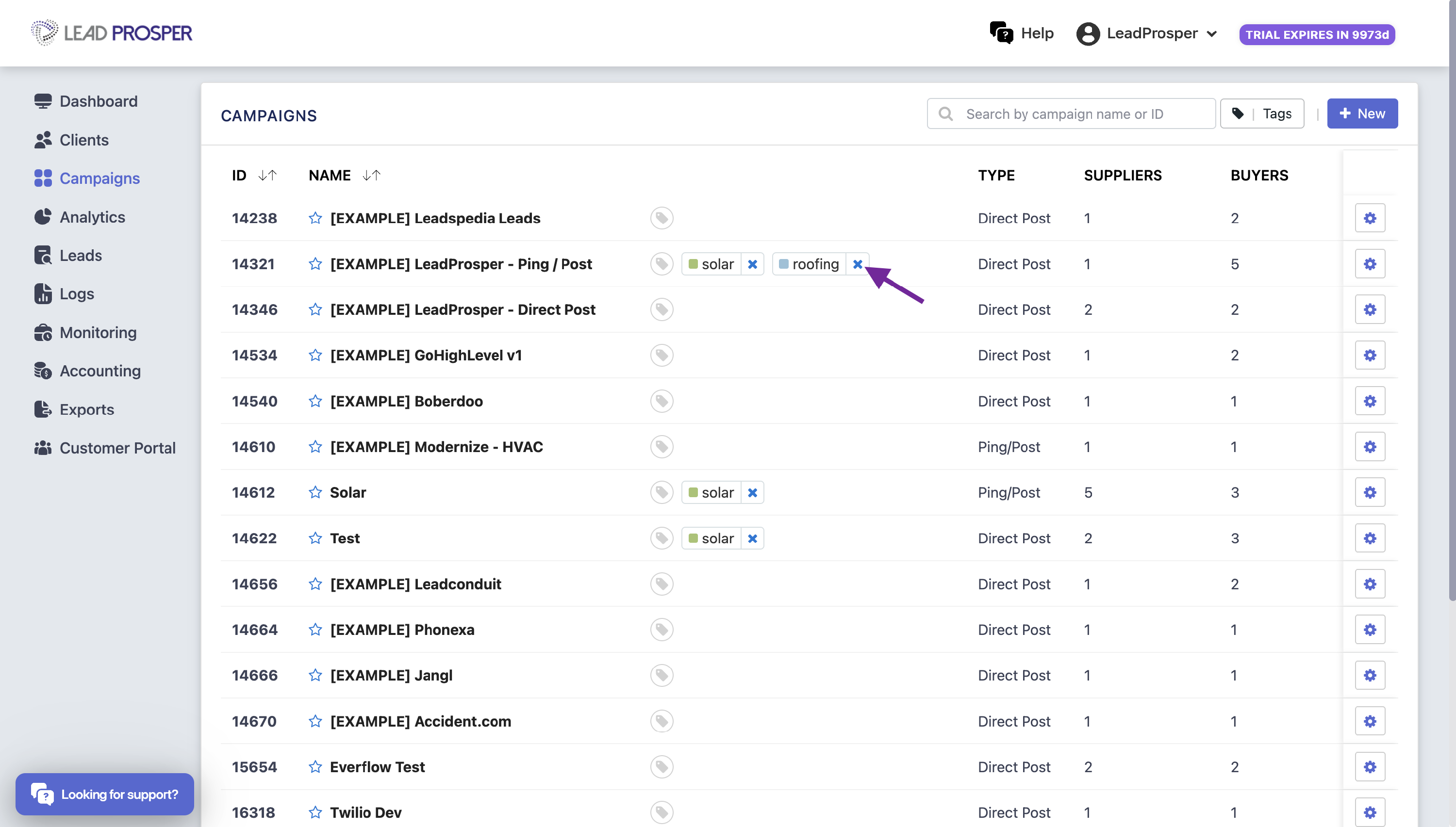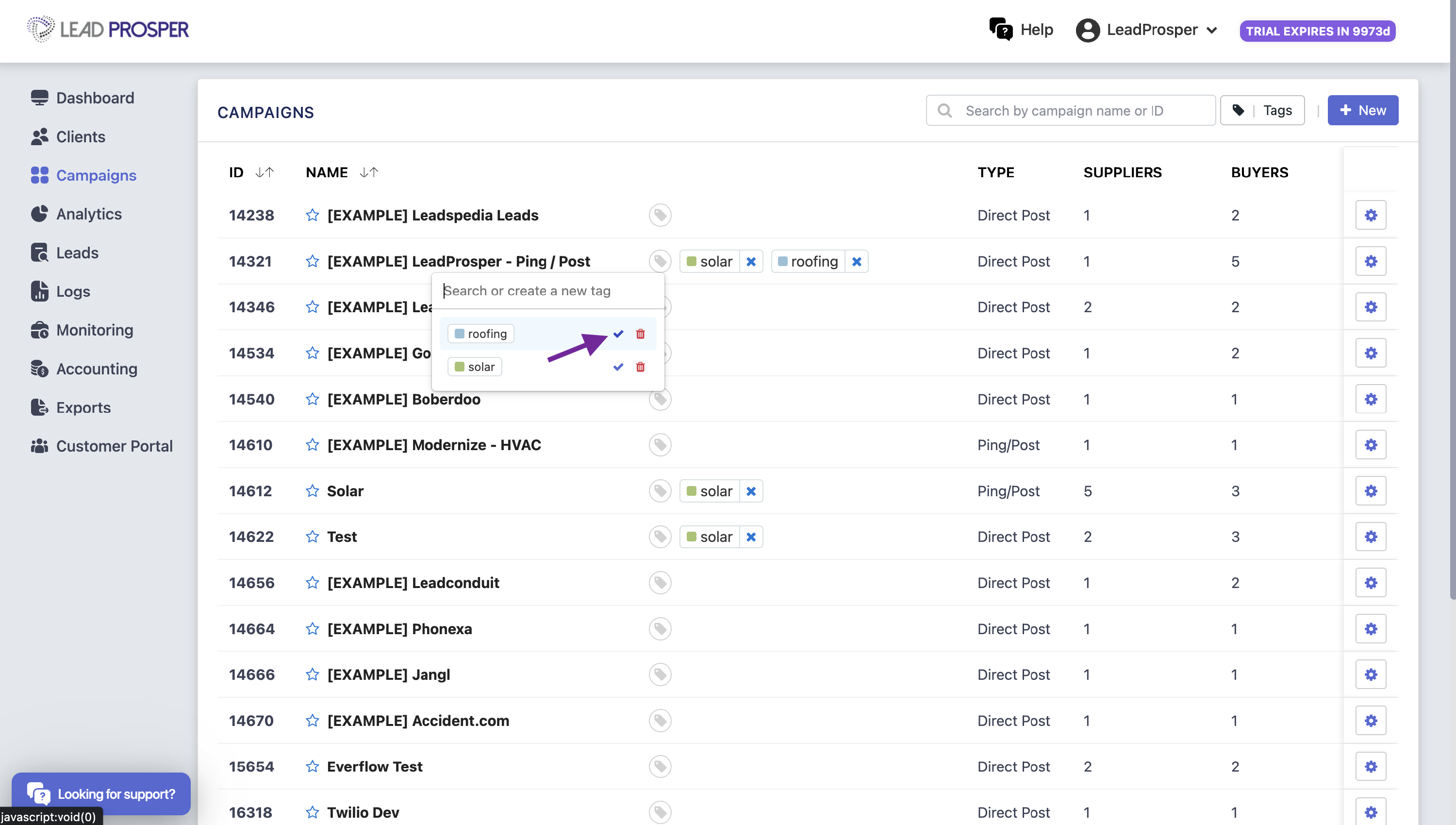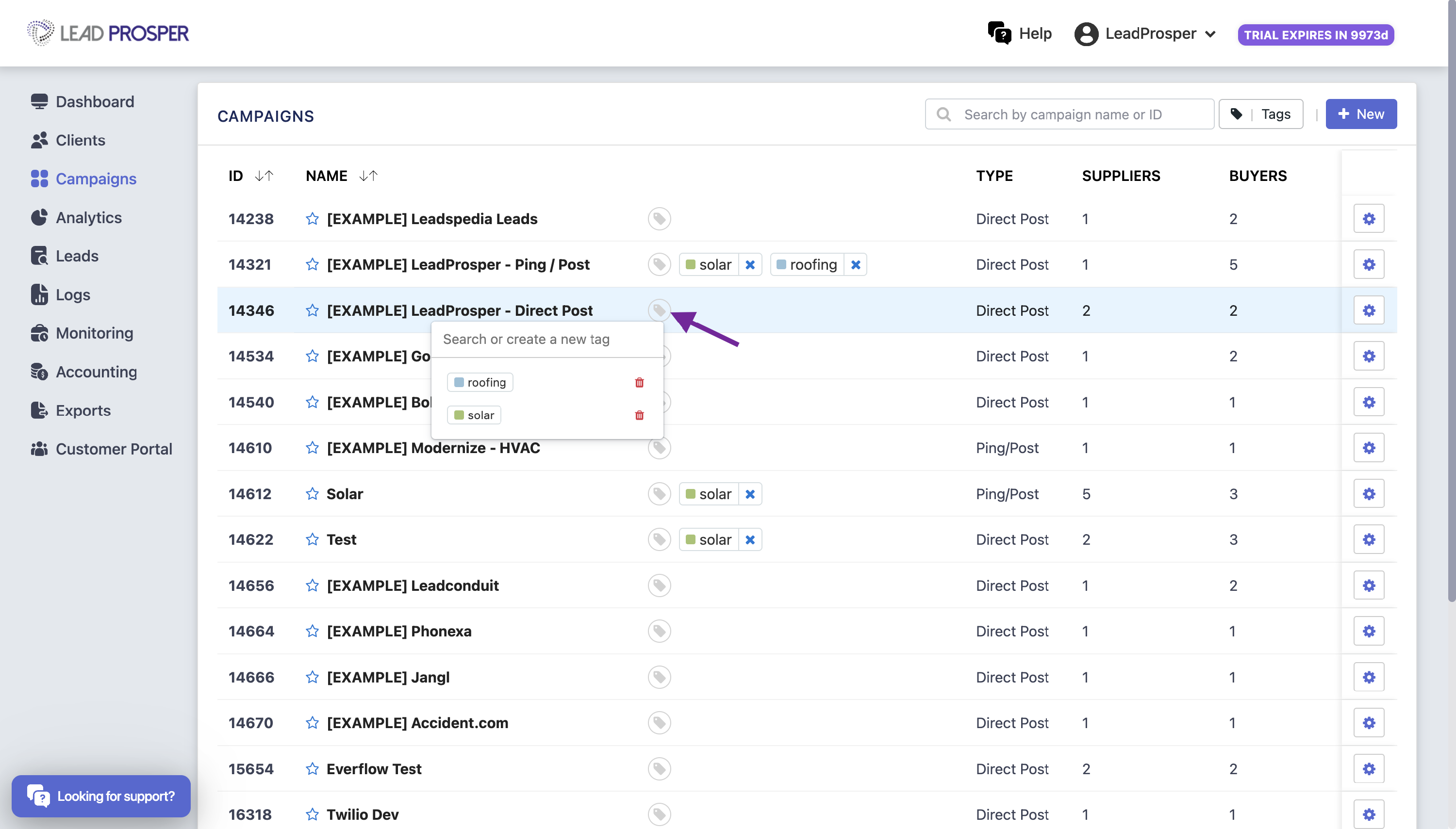 To create a tag, click the tag icon to the right of the campaign and enter your tag name
