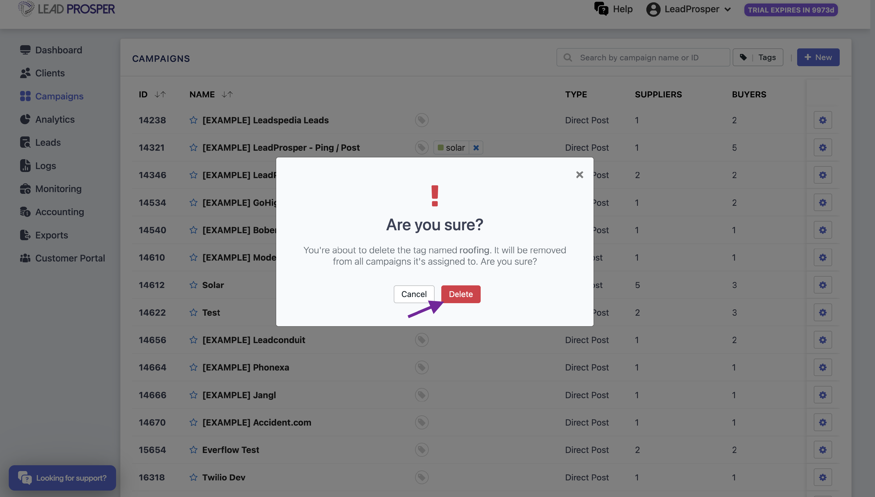 To delete a tag completely from all campaigns, click the tag icon then, click on the trash can icon to the right of the tag. This will permanently delete the tag from ALL campaigns and cannot be undone!