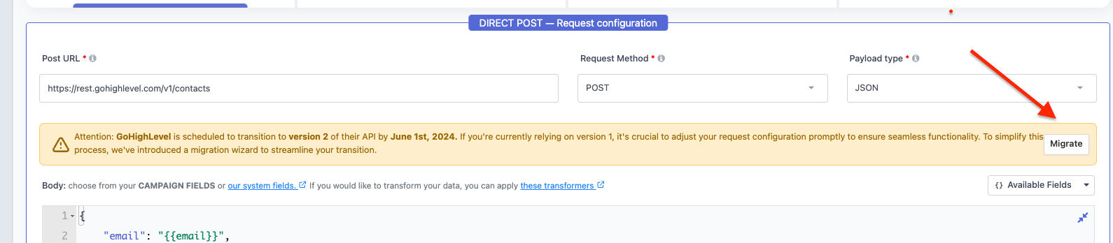 Starting June 2024 GoHighLevel will be transitioning their API from version 1 to version 2, and unfortunately that will make posting to GoHighLevel buyers difficult moving forward. In an effort to make this transition as smooth as possible for our users we have put together a Migration Wizard for Lead Prosper users that will walk you through every step needed to migrate and ensure all of your GoHighLevel buyers are ready to use version 2 when they make the switch. This will involve creating a Webhook URL in GoHighLevel for each sub-account, and then following the wizard for each GoHighLevel buyer in your campaigns.