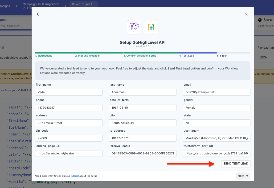 On the next page you will see the random generated values spun up for sending a Test Lead to GoHighLevel. Confirm that everything looks correct and then hit Test Lead to send that test to your GoHighLevel Webhook URL.
