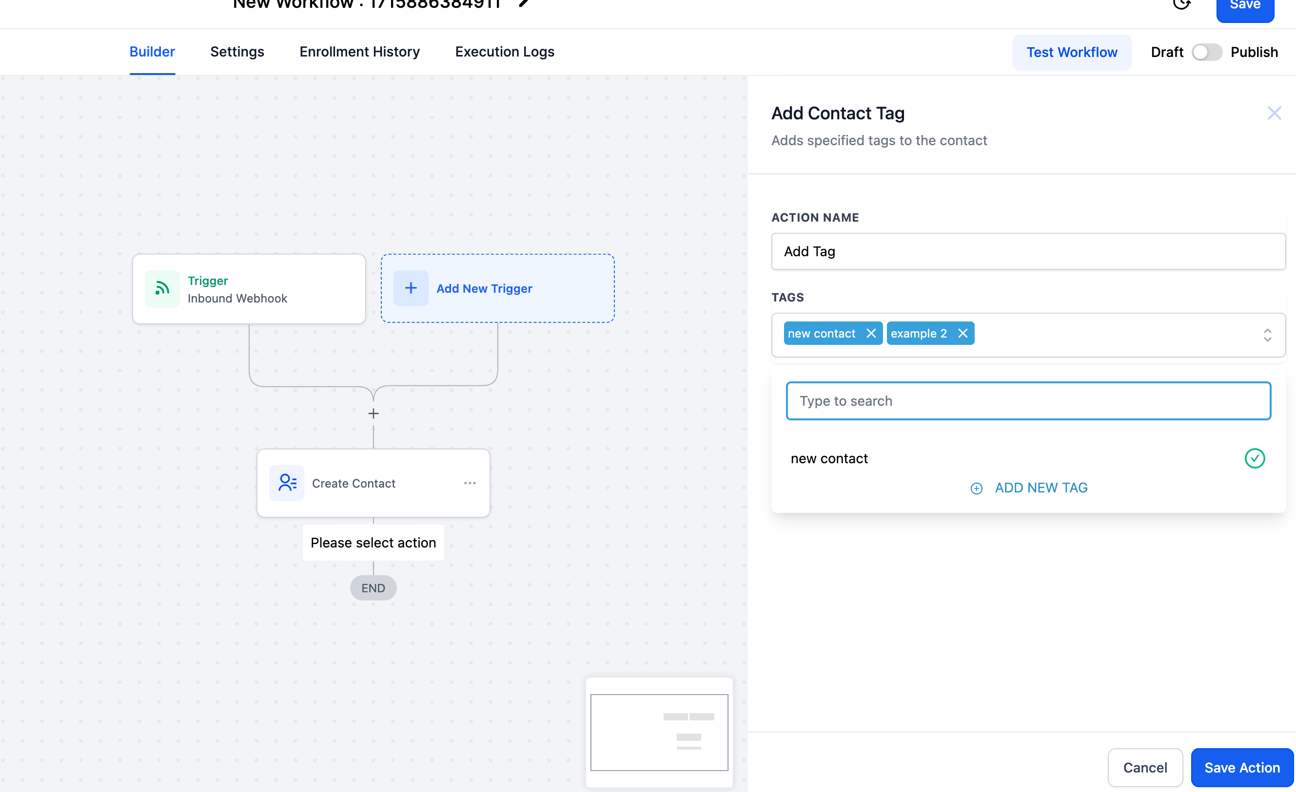 If you want to add any secondary actions, such as adding tags to your contact, sending an email, or any number of actions, you can click the + button, find the Action that you want to add, and enter the details. These actions will perform after the initial Contact is created.