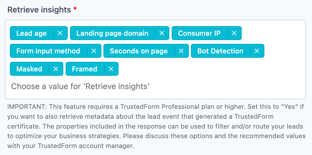 Having Insights enabled allows you to check the Trusted Form cert against 5 different data points. You can select any of these and configure to your specifications. This includes the following: