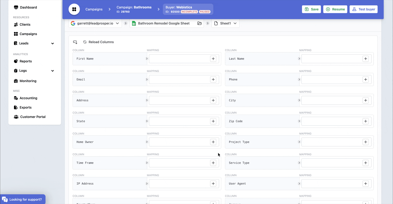 Once you select the worksheet, Lead Prosper will pull in the column headers from that sheet.