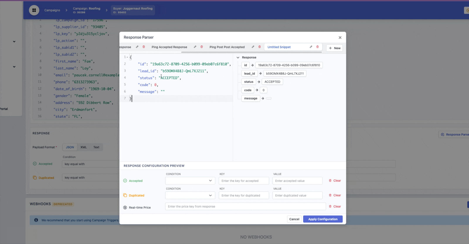 Lead Prosper just launched a new, improved Response Parser tool that makes setting up mappings and utilizing data from your buyer's API responses easier than ever. In a handful of clicks you can easily set your buyer's accepted response mapping, real-time price, duplicate mapping, and create variables that you can use in your buyer payload to place and manipulate data that is returned in the buyer's API response(s).
