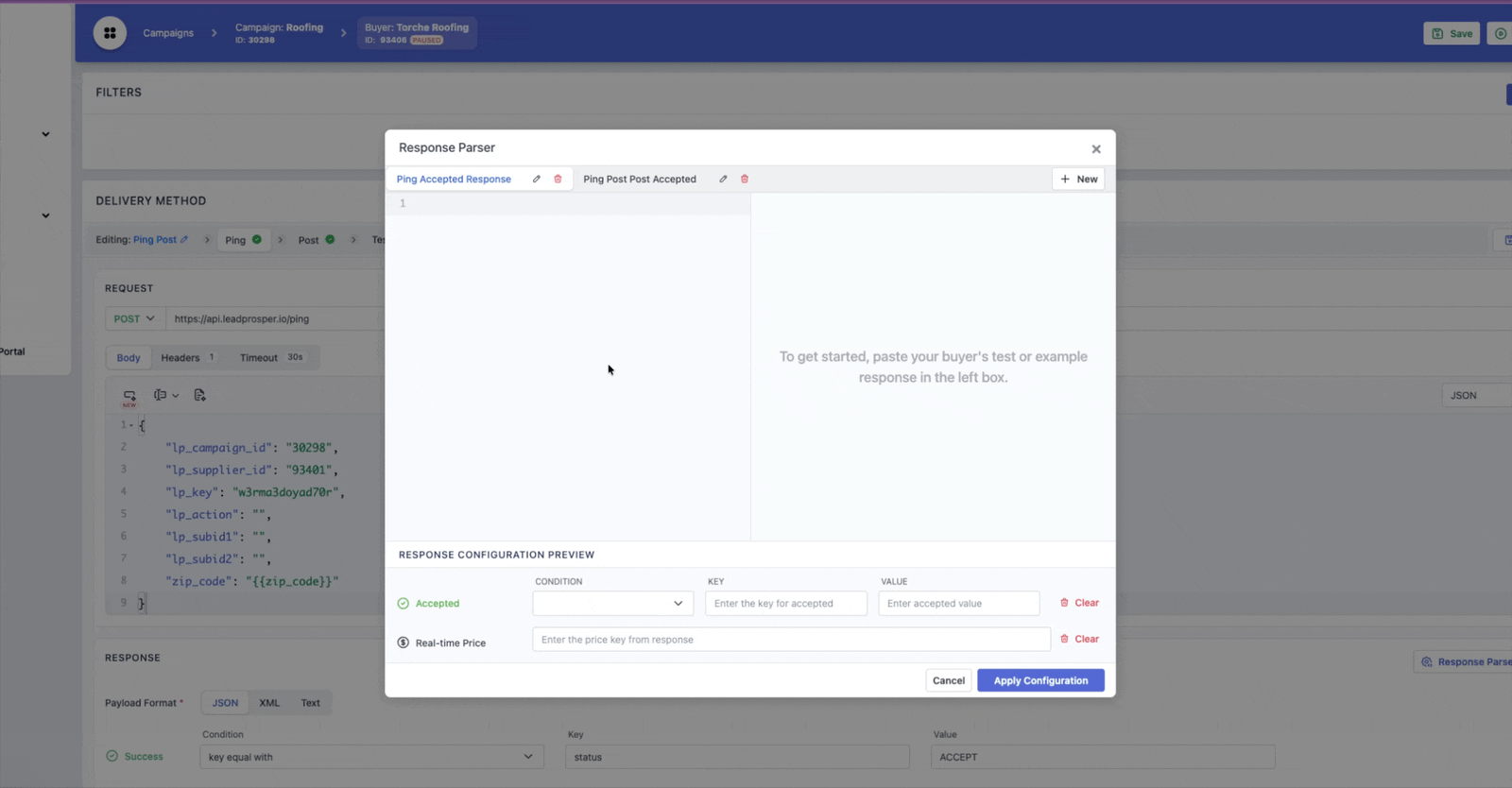 When working with Ping Post buyers, you’ll usually receive a bid price in the buyer’s PING response. On the PING step, open the Response Parser, paste in your example response, and you can set the Real-Time Price in just two clicks.