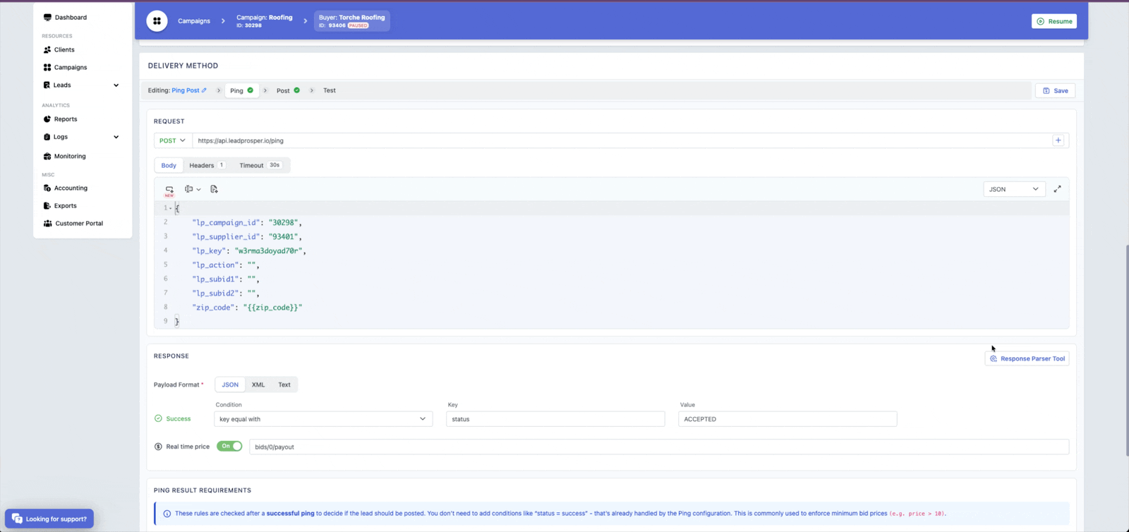 If you have a Ping Post buyer that requires pulling a ping_id from the buyer’s PING API response, the process is now much simpler. Previously, you had to reference the {{lp_ping_response:KEY}} system field and manually identify the correct key from the PING response. This can be used for any value in the PING API response that you need to extract.